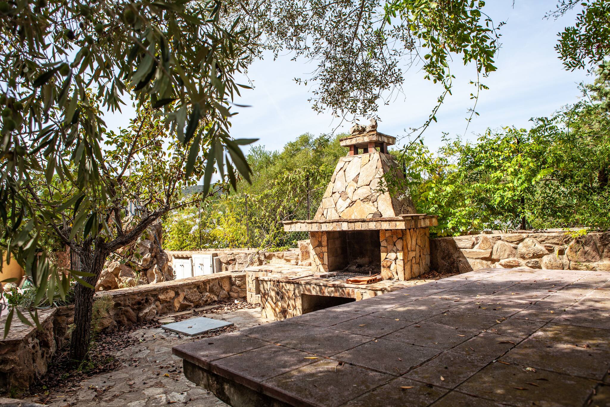 Barbecue et table en pierre pour grillades en extérieur.